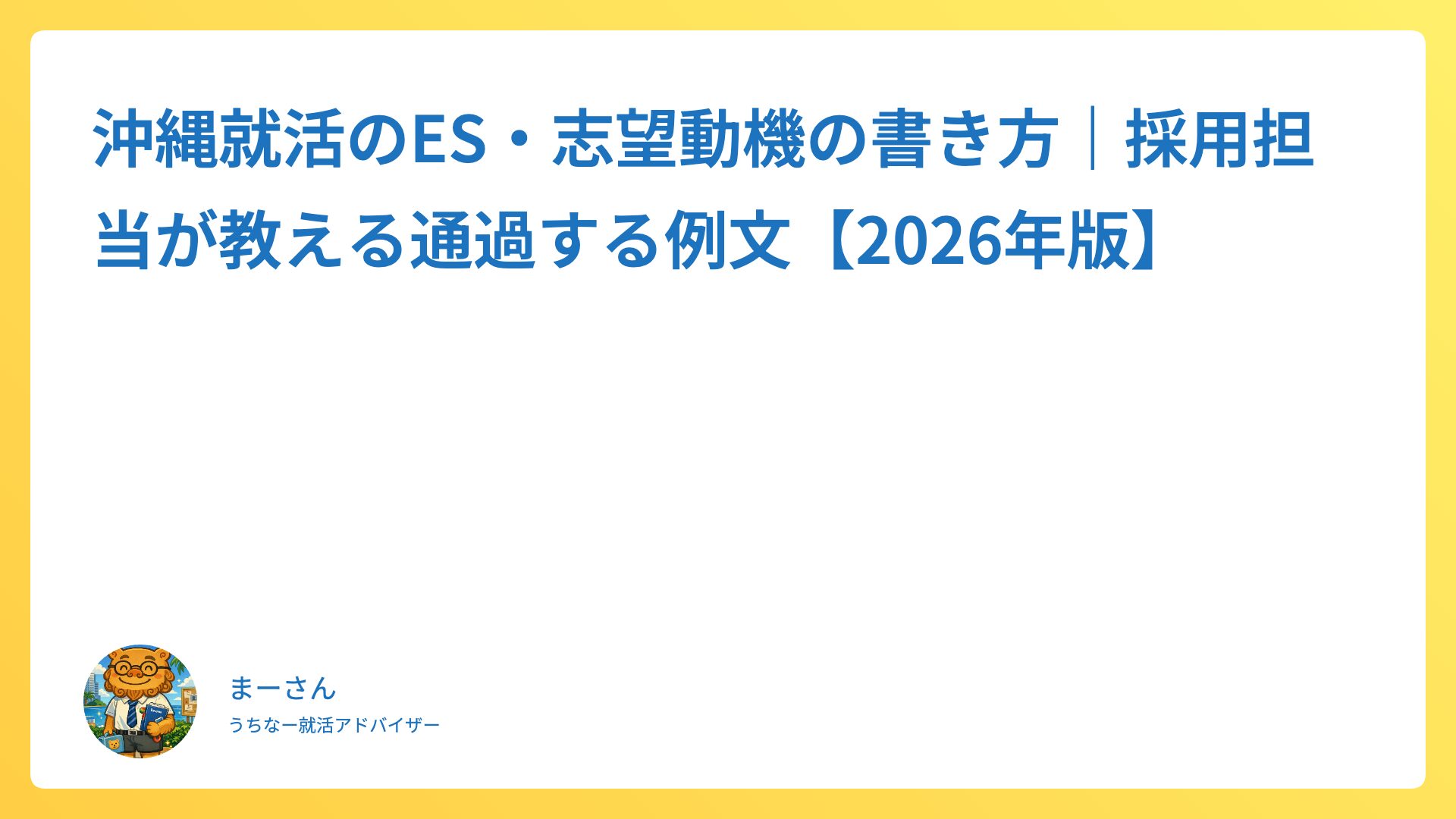 沖縄就活のES・志望動機の書き方|採用担当が教える通過する例文【2026年版】 2026.03.16 就活の始め方 まーさん 沖縄就活スタートガイド 沖縄就活のスケジュール完全ガイド|大学3年生が今すぐやるべきこと【2026年版】【採用担当が解説】 2026.03.15 沖縄の就職事情 まーさん 沖縄就活スタートガイド 沖縄就活の自己分析|採用担当が教える「内定につながる強み」の見つけ方【2026年版】 2026.03.14 沖縄の就職事情 まーさん 沖縄就活スタートガイド 【沖縄就活】企業選びで後悔しないための口コミ活用法|OpenWorkの使い方と全国基準の見方 2026.03.12 沖縄の就職事情 まーさん 沖縄就活スタートガイド 【2026年版】沖縄の就活は何から始める?まだ何もしてない大学3年生が今すぐやるべき5つのこと 2026.03.11 人気記事 まーさん 沖縄就活スタートガイド 【2026年版】琉球大学は就職が厳しい?就職率と県内就職のリアルをデータで解説 2026.03.05 沖縄の就職事情 まーさん 沖縄就活スタートガイド 【要注意】沖縄の就活面接、知らないと普通に落ちます|最初に対策すべき3つのこと 2026.02.04 人気記事 まーさん 沖縄就活スタートガイド 沖縄の新卒年収で一人暮らしはできる?手取り17万円の生活費をリアルに全公開【2026年版】 2025.09.30 人気記事 まーさん 沖縄就活スタートガイド 【2026年版】沖縄ホワイト企業ランキング10社|年収・残業・休日を就活目線で徹底解説 2025.09.25 沖縄の就職事情 まーさん 沖縄就活スタートガイド 【2026年版】沖縄の就活が厳しい本当の理由|正社員求人倍率0.7倍の現実と今すぐできる対策 2025.09.18 沖縄の就職事情 まーさん 沖縄就活スタートガイド